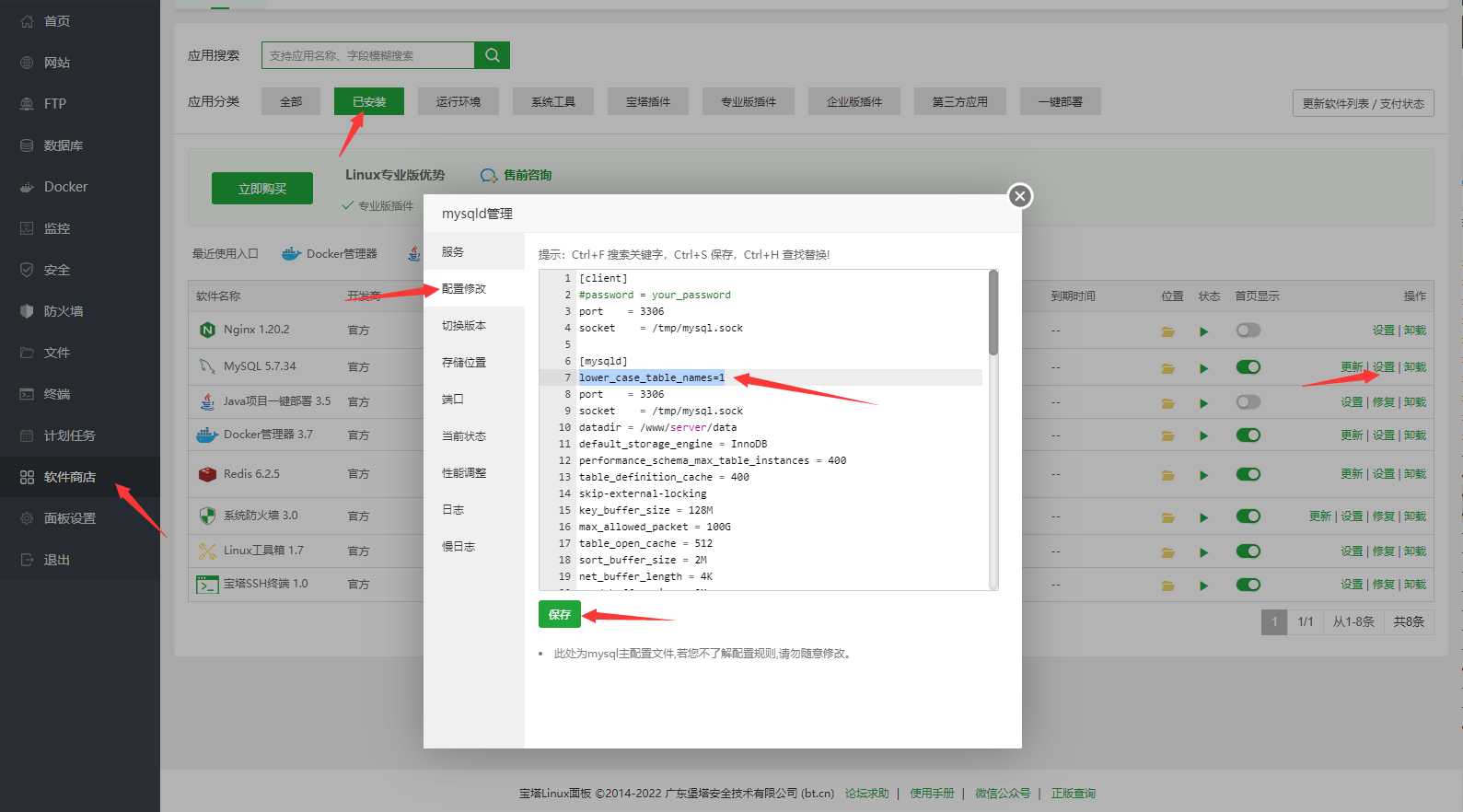 其中MySQL可能需要设置忽略表明大小写参数lower_case_table_names=1,配置过程如图: